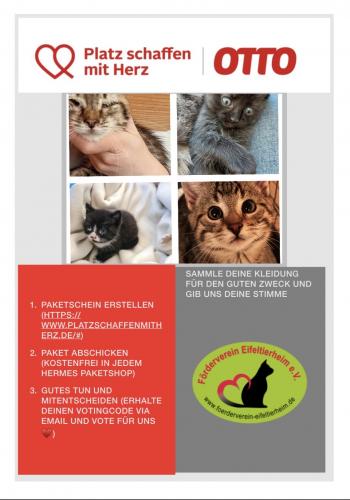Der Förderverein e.V. nimmt mit seinem Spendenprojekt "MIAU - Hilfe für unsere Katzennotfä(e)lle" bei PLATZ-schaffen-mit-HERZ von OTTO teil. Zur Kostendeckung für unsere Schützlinge benötigen wir dringend Spenden. Bitte teilt diese Aktion mit tierlieben Menschen.