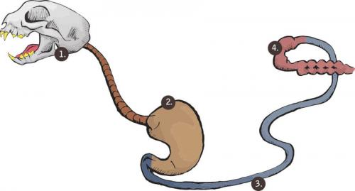 Im Kopfdarm wird die Nahrung mittels der Zähne gepackt und zerkleinert. Durch den Speichel werden die Nahrungsbestandteile gleitfähig gemacht und erleichtern das Abschlucken. Im Magen angekommen werden die Futterbrocken zu Nahrungsbrei verarbeitet und mit Magensaft, welcher Säuren und Verdauungsenzyme beinhaltet, angereichert. Durch Muskelkontraktionen wird die Nahrung weitergeleitet in den Dünndarm, welcher relativ kurz ist. Im Dünndarm werden Gallenflüssigkeit und Bauchspeicheldrüsensaft zugesetzt und helfen so bei der Aufspaltung und Aufnahme von Proteinen, Fetten und Kohlenhydraten. Der Dickdarm dient der Rückführung des Wassers aus den nicht verwertbaren Futterbestandteilen. Zudem werden wasserlösliche Vitamine, Salze und essenzielle Fettsäuren im Dickdarm aufgenommen. Dies dient der Eindickung der übrig bleibenden Futterbestandteile, welche schlussendlich wieder ausgeschieden werden.
