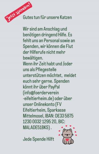 Die Vermittlung der Katzen, die ein Zuhause suchen, verzögert sich oft wegen krankheitsbedingtem, sehr pflegeaufwändigem Zustand der Tiere. Besonders scheue Kitten verweilen durch schlimme Infektionen sehr lange auf den Pflegestellen. Immense Tierarztkosten sind die Folge. Tägliche Notrufe aus der Bevölkerung erreichen unseren Verein und überfordern die Tierschutzarbeit der Ehrenamtlichen. Auch während der Krisenzeit waren wir ununterbrochen für den Tierschutz im Einsatz; dieser Virus bremste unsere Aktiven nicht aus. Durch die Coronaauswirkungen sind regelmäßige Spenden rückläufig. Leider sind die Tierarzt-Gebühren seit November 2022 drastisch gestiegen; somit wird die medizinische Versorgung unserer Schützlinge noch kostenintensiver. Aber wir lassen die Notfä(e)lle nicht im Stich.