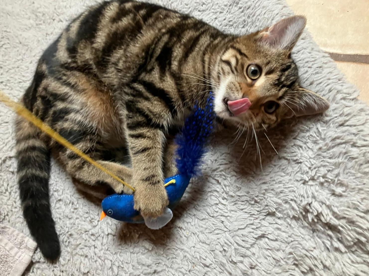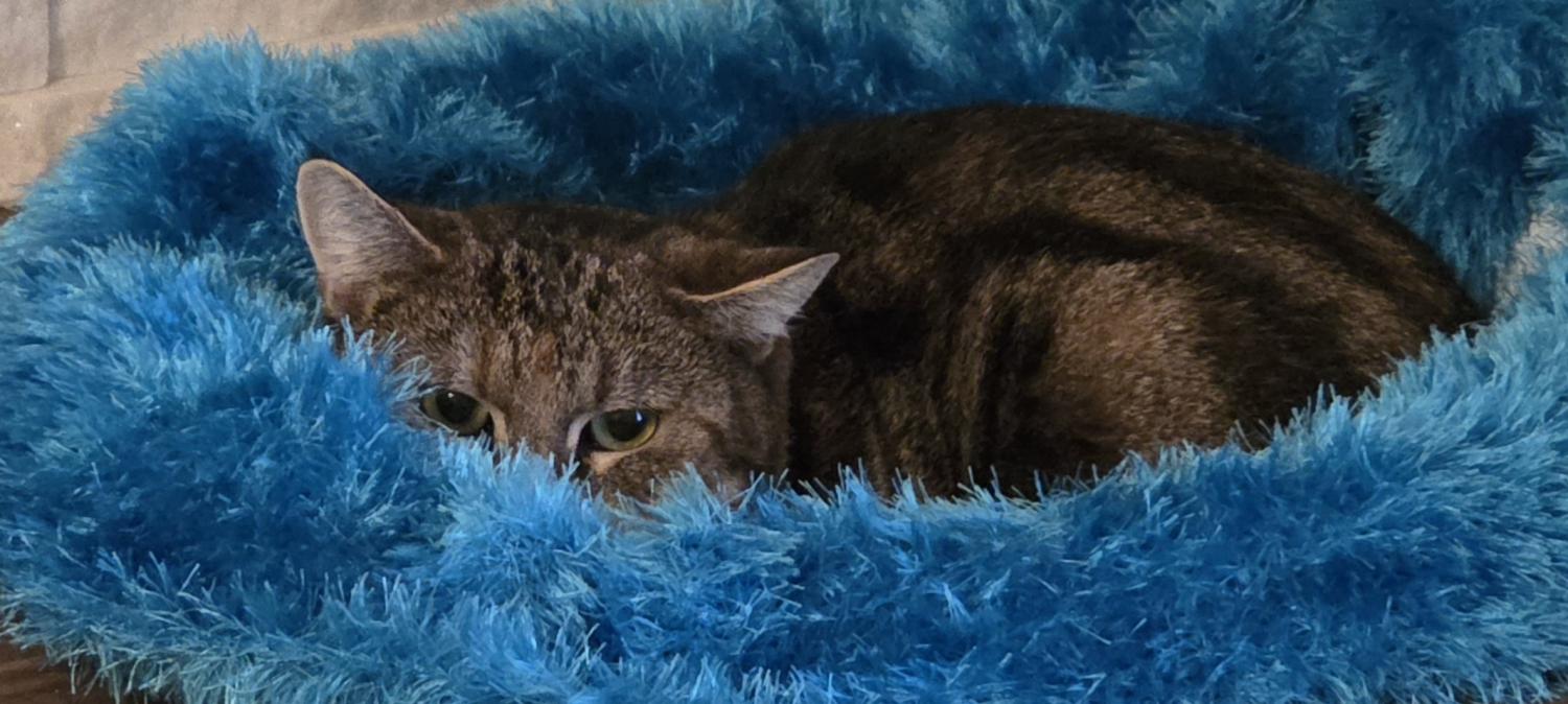 Teddy (ca. 11 Jahre, graubraun getigert) ist ein echter Seelentröster – sanft, verschmust und immer bereit für eine ausgiebige Bauchmassage.